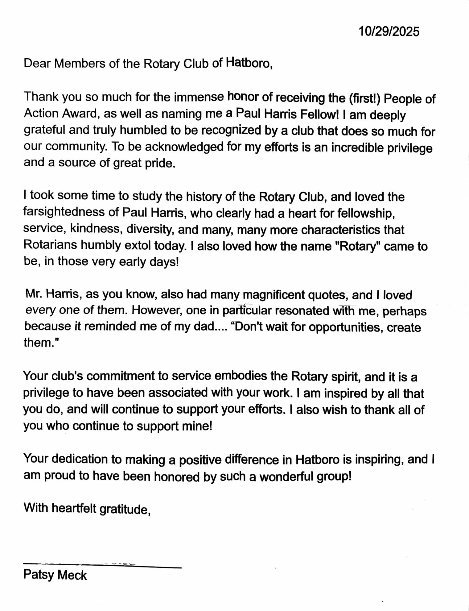 The Rotary Club of Hatboro proudly recognizes Patsy Meck as the recipient of its first-ever People of Action Award, honoring her outstanding service and lasting contributions to the Hatboro community. She was also named an honorary Paul Harris Fellow, one of Rotary’s highest recognitions for those who exemplify the motto “Service Above Self.”